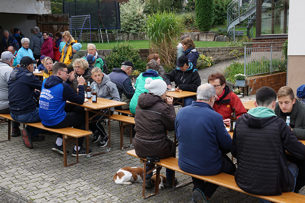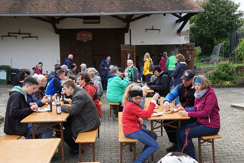 Nach gut der Hälfte der Wanderroute bot sich die Gelegenheit, in Weimersheim bei Speis und Trank zu rasten. Ein herzlicher Dank geht hierbei an die Familie Beil, die ihren Hof kurzerhand zum Rastplatz umgestaltete. Zurück über Hattenhof sollten die letzten Kilometer etwas windig werden, doch letzlich kamen alle Wanderbegeisterten wieder fröhlich am Sportheim an. Dort warteten noch die beiden Fußballspiele der Seniorenmannschaften, die sich über großen Zuschauerzuspruch freuen konnten. Alles in allem ein gelungener Tag im Kreise der Eintracht Familie!