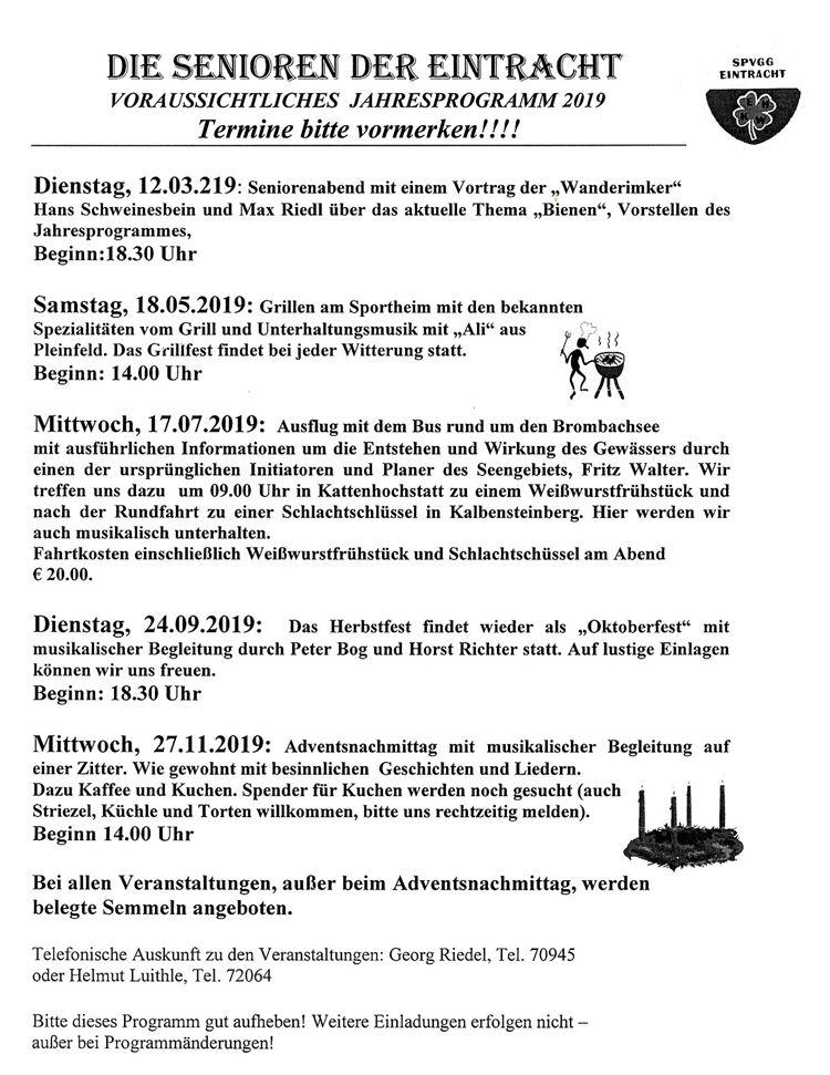Seit dem Jahr 2002 besteht bei der Eintracht eine Seniorengruppe, in welcher sich die "rüstigen Rentner" des Vereins engagieren. Neben unzähligen freiwilligen Arbeitsdiensten und zahlreichen weiteren Einsätzen für den Verein werden neben Ausflügen und gemeinschaftlichen Essen auch spannende Vorträge im Sportheim organisiert. Das Jahresprogramm der Seniorengruppe ist stets sehr abwechslungsreich, sodass für jeden Interessierten etwas dabei sein dürfte.